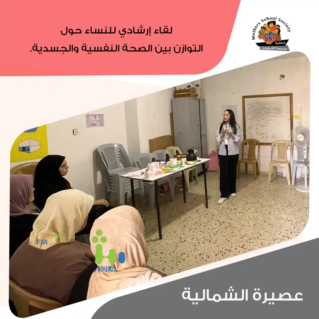 نفذت جمعية مدرسة الأمهات لقاءً توعوي للنساء بعنوان (التوازن بين الصحة النفسية والجسدية )، ضمن برنامج الإرشاد النفسي، وذلك في مقرها التايع لها بعصيرة الشمالية و ذلك بحضور مجموعة من النساء من مختلف الفئات العمرية.